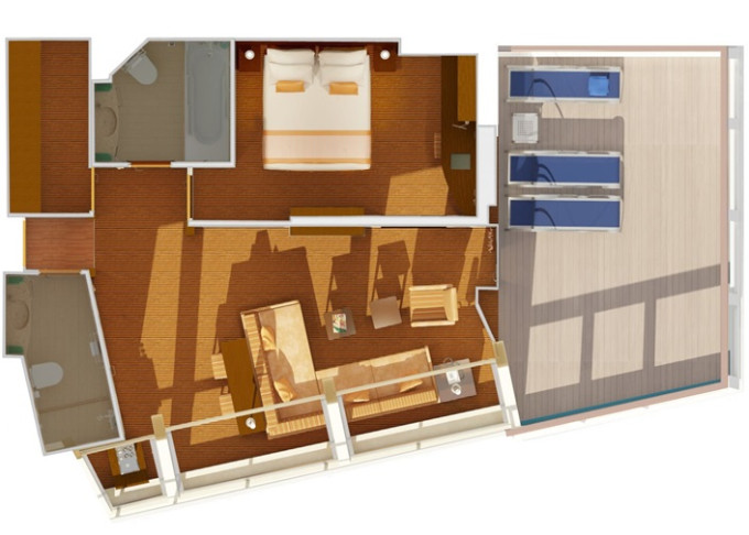 | CS - Captain's Suite 51 m² + 24 m² balkón. 9. paluba vpredu. Výhody Suite. | 6 272 € 3 136 € za osobu | ||