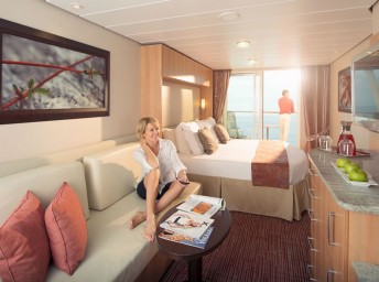 • Kajuty sú umiestnené v blízkosti lodného Spa. K ich vybaveniu patrí posilnený systém vzdušnej filtrácie, posteľ Queen-Size (v kategóriách Edge King-Size), veľké zasúvacie sklenené dvere, exkluzívne posteľné prádlo eXhale®, veľkorysé skladovacie priestory.