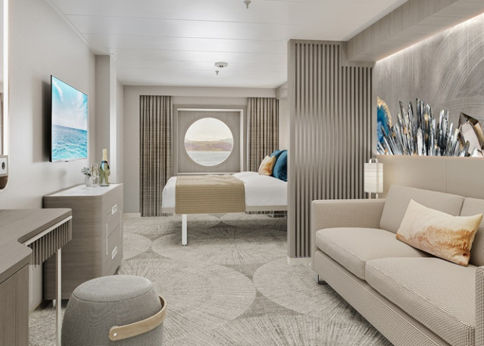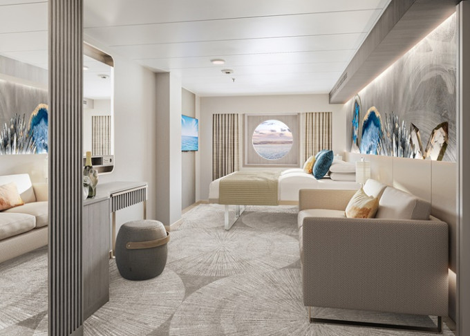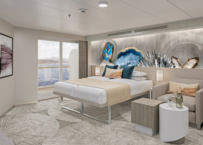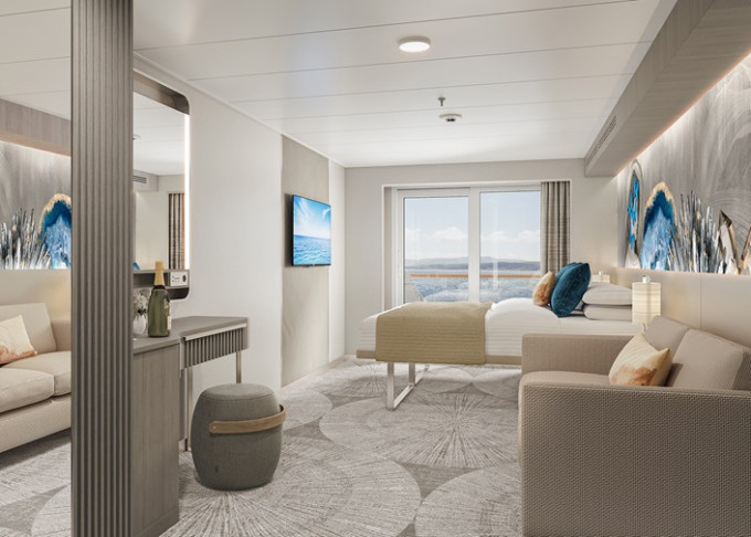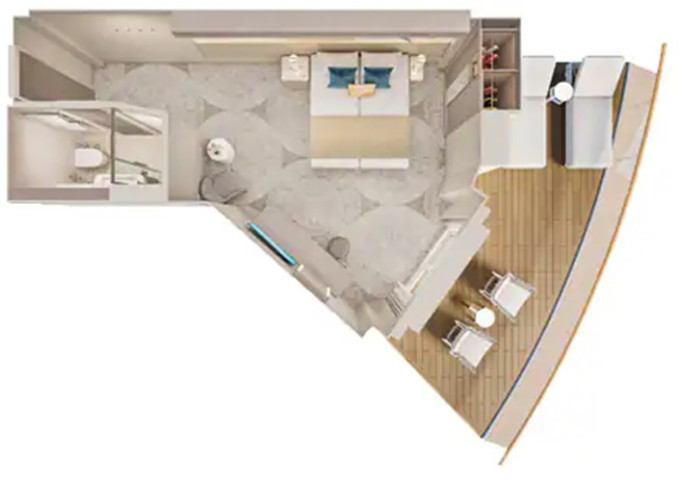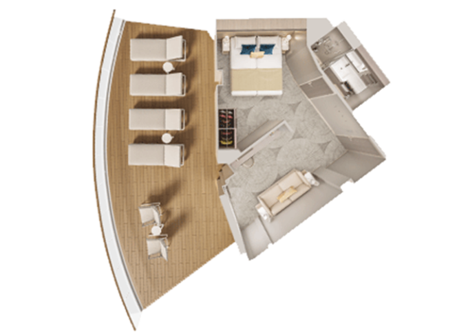 SH - Suite s veľkým balkónom Aft-Facing 58 m² / balkón 34 m². 9. paluba - vzadu. Max 4 osoby. Výhody Suite. 5 732 € 2 866 € za osobu
