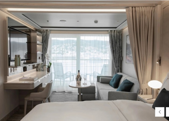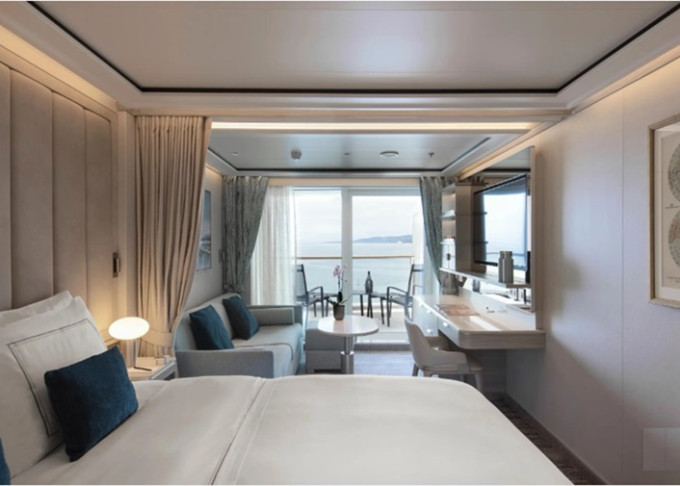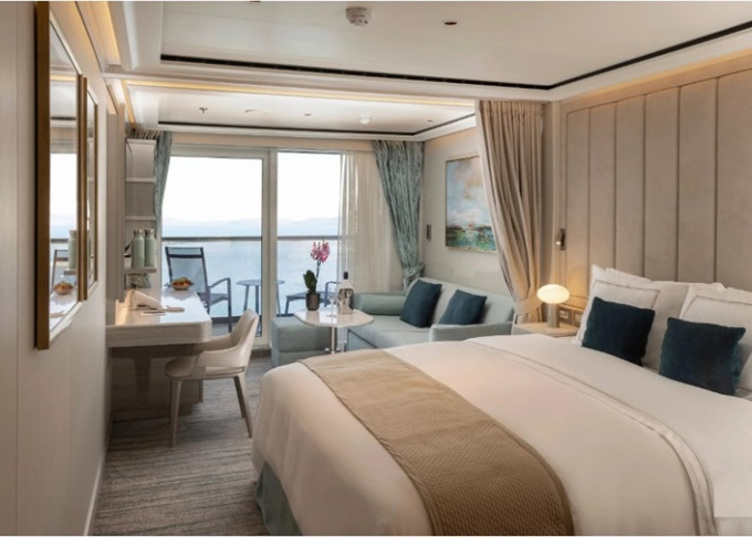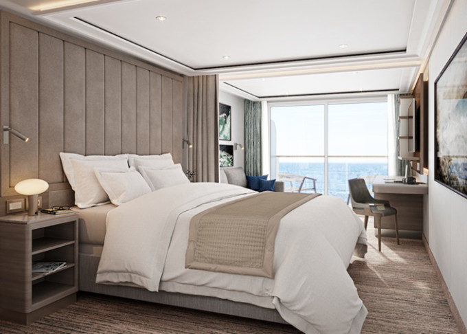 13 kategórií, 364 priestranných kajút/suít. Každá suita má okná od podlahy až po strop so súkromnou sklenenou balustrádou, výhľad na oceán a teakovú verandu.