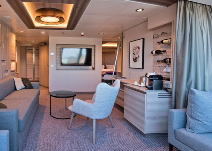 MD - Expedition Large Suite s balkónom ♿ 35 m². Balkón. TV, minibar, varná kanvica, kávovar. Bezbariérová kajuta♿ 7. paluba vpredu. Max 4 osoby. Výhody Suite. 21 520 € 10 760 € za osobu