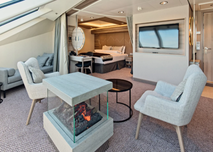 - Aft-facing apartmány suites v zadnej časti lode s vlastnými virivkami na terase