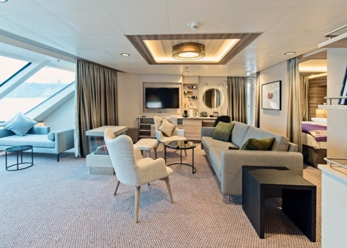 ME - Expedition Suite s balkónom 20-28 m². Balkón. TV, minibar, varná kanvica, kávovar. 8,9. paluba. Max 4 osoby. Výhody Suite. 19 058 € 9 529 € za osobu