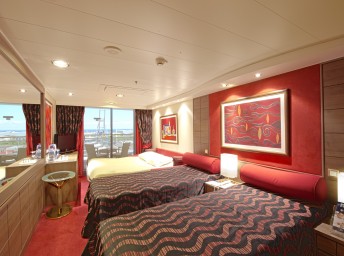 Suite s balkónom: cca31m², kajuta s manželskou posteľou (na požiadanie 2 oddelené postele) a rozkladacia pohovka. Klimatizácia, kúpeľňa s vaňou, toaletný stolík, priestorná skriňa, interaktívna TV, telefón, minibar, sejf, sušič na vlasy. Balkón so stolíkom a stoličkami. Internetové pripojenie (za poplatok).