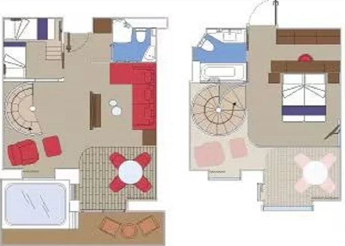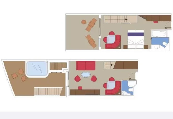 | YJD - Yacht Club Duplex Suite s vírivkou 46 m² + balkón 28-31 m². Vírivka. 2 podlažia, šatník, 2 kúpeľne (1 s vaňou). Max 4 osoby. 16. paluba. Cenový model MSC Yacht Club. | 7 950 € 7 950 € za osobu |
