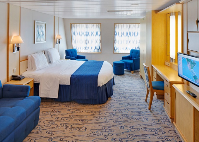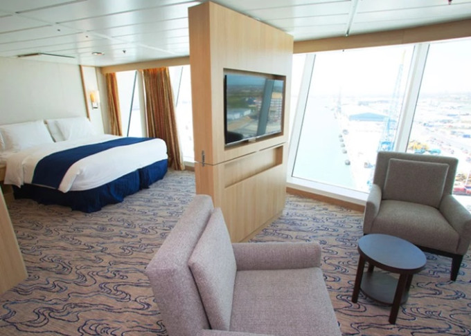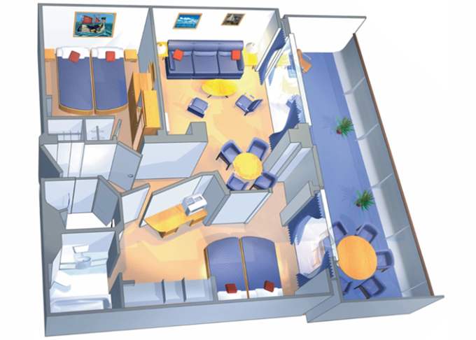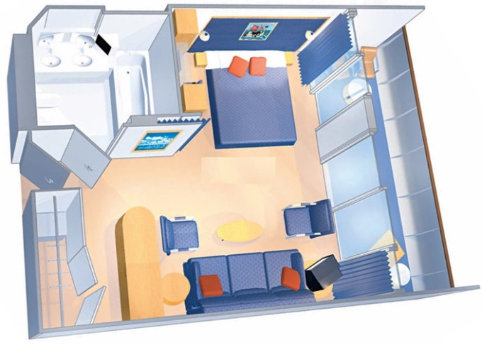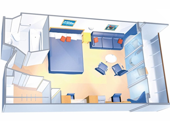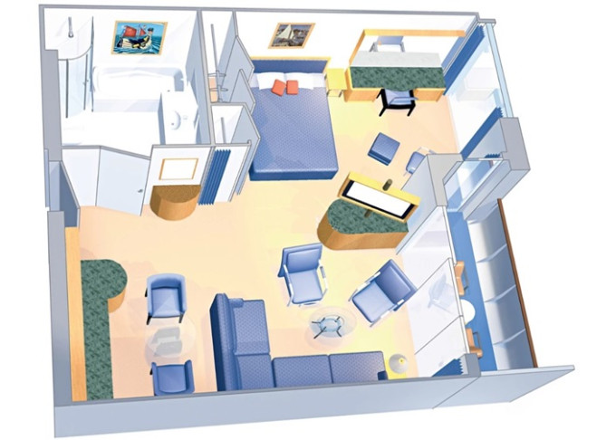 VP - Ocean View Panoramic Suite (bez balkónu) 37 m². Panoramatické neotvárateľné okná. Oddelená časť s poschodovou posteľou. Extra WC. 12. paluba. Max 6 osôb. Výhody Suite. 4 002 € 1 334 € za osobu