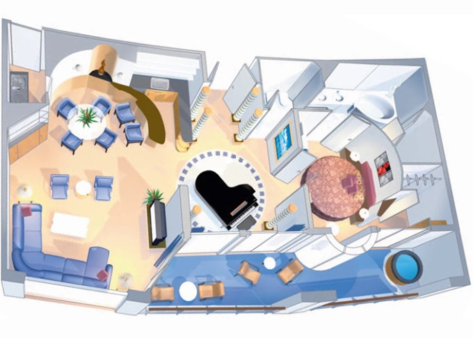 • "Peek-a-boo bridge" výhľad na kapitánsky mostík, kde máte jedinečnú príležitosť nakúkať cez plece kapitánovi a posádke pri riadení lode (celkom na prove, 11. paluba)