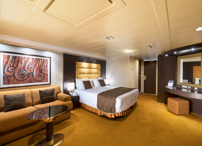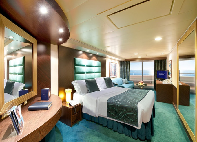 Suite s balkónom/panoramatickým oknom: 21-47m², (Royal 53m², Family 52m²)kajuta s manželskou posteľou (na požiadanie 2 oddelené postele) a rozkladacia pohovka. Klimatizácia, kúpeľňa s vaňou, toaletný stolík, priestorná skriňa, interaktívna TV, telefón, minibar, sejf, sušič na vlasy. Balkón so stolíkom a stoličkami/panoramatické okno. Internetové pripojenie (za poplatok).