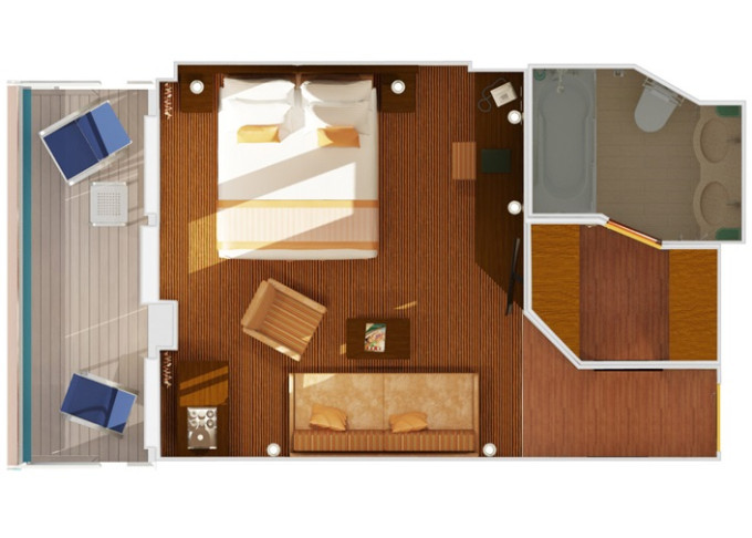 OS - Ocean Suite 25 m² + balkón 6 m². 7. paluba vpredu, stred. Max 4 osoby. Výhody Suite. 1 442 € 721 € za osobu