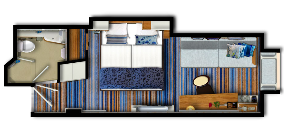 Vo všetkých kategóriách sa nachádza regulovateľná klimatizácia, safe, kúpeľňa so sprchou, sušič na vlasy, telefón, Tv s plochou obrazovkou, župany, papuče a kávovar Nespresso (v cene plavby sú aj 2 kapsule na kajutu denne).