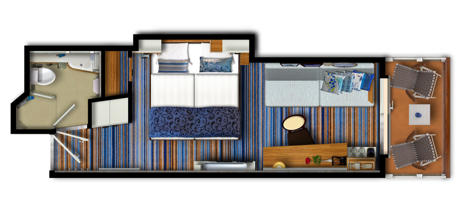 | BAHO - Kajuta s balkónom kat. H / obmedzený výhľad 17 m² + balkón s obmedzeným výhľadom 5 m². 6-9. paluba. Max 3 osoby. | 2 798 € 1 399 € za osobu |