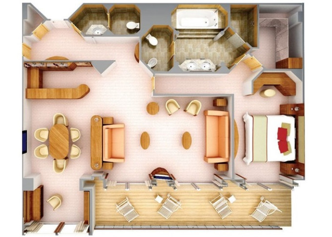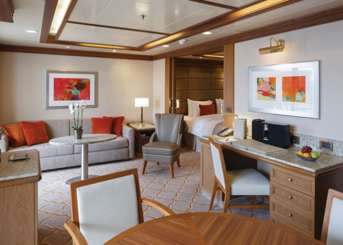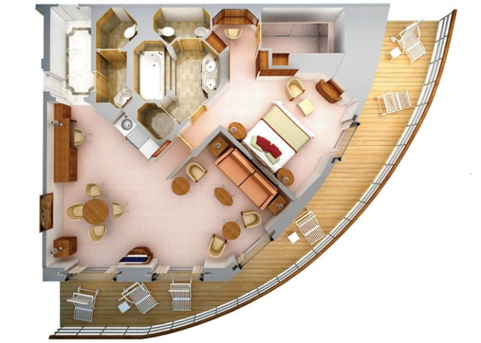 | R1 - Royal Suite 1 92 m² (vrátane balkóna 12 m²), Spálňa s obývacou a jedálenskou časťou. 7. paluba vpredu. Max 3 osoby. | 33 000 € 11 000 € za osobu | ||