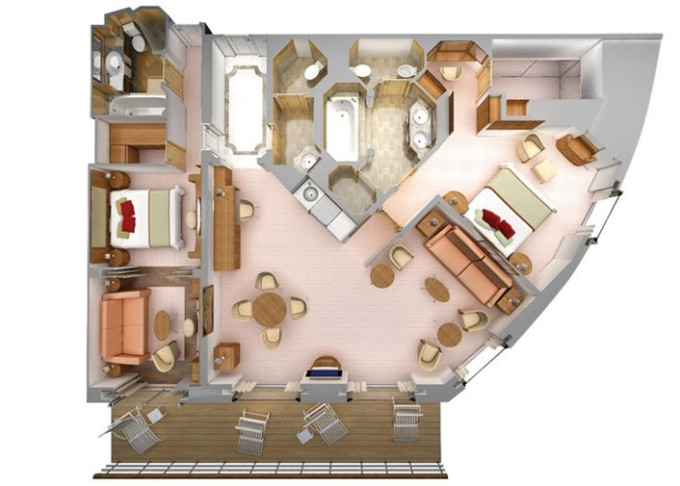 | R2 - Royal Suite 2 127 m² (vrátane 18 m² balkónov). Royal Suite prepojená s Veranda Suite. 7. paluba vpredu. Max 5 osôb. | 65 200 € 16 300 € za osobu |